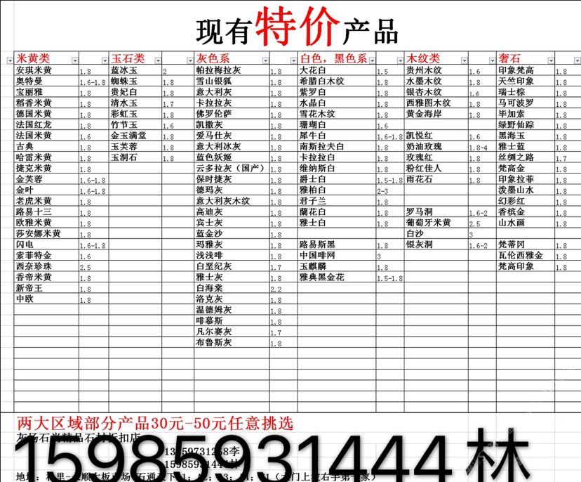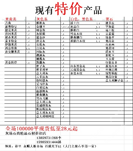 現(xiàn)有100000平大板特價(jià)(百來個(gè)品種),低至30元起