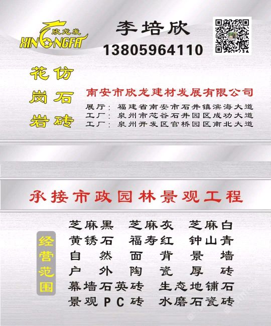 南安市欣龍建材發(fā)展有限公司,位于建材之鄉(xiāng)—福建省南安市石井鎮(zhèn),公司旗下?lián)碛袃纱笾髁Ξa(chǎn)品:花崗巖?仿石磚。(一)花崗巖:廠礦一體,荒料?大板?成品精加工,一站式供應(yīng)。擁有芝麻黑、芝麻灰、芝麻白、銹石、蝦紅、小藍(lán)寶、藍(lán)寶石、泉州紅、永定紅、福壽紅、福建青、鐘山青、喬治亞灰、G606、G617等品種,承接幕墻干掛、園林景觀、市政廣場(chǎng)、機(jī)場(chǎng)高鐵、別墅豪裝、酒店精裝、異形雕刻、自然面背景墻等工程。為石而生,匯聚石尚生活! (二)仿石磚:戶外陶瓷厚磚,接受客戶需求定制。不是石材,更勝石材!抗壓強(qiáng)度高、抗凍性能好、防滑耐磨、綠色環(huán)保。擁有幕墻石英磚、生態(tài)地鋪石、景觀PC磚、環(huán)保熔巖板、陶瓷透水磚、水泥PC磚等系列產(chǎn)品。采用先進(jìn)的技術(shù)與工藝,融匯東西方精粹,不斷創(chuàng)新,將不同文化風(fēng)尚及搭配方式重新組合設(shè)計(jì),開(kāi)發(fā)現(xiàn)代新穎的產(chǎn)品,造就逼真無(wú)瑕的自然外觀質(zhì)感,滿足全球客戶不斷發(fā)展的個(gè)性化需求。產(chǎn)品廣泛應(yīng)用于園林小區(qū)、商業(yè)地產(chǎn)、公園廣場(chǎng)、市政道路、高鐵地鐵、酒店賓館、居家庭院、步行街、寫字樓、度假村、機(jī)場(chǎng)、學(xué)校、醫(yī)院、綠道等干掛鋪裝場(chǎng)所。因?yàn)閷W?,所以專業(yè)!