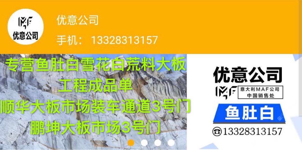 發(fā)布信息: 優(yōu)意公司是意大利MAF公司中國銷售處,03年開始在中國銷售魚肚白、雪花白、大花白、卡拉拉白、卡金,卡拉卡塔,魚肚金荒料、大板、薄板,復合板,工程板、線條,馬賽克,異型加工、工藝品,承接工程成品單。合作電話,郭??13950008780;張?? 18950052806