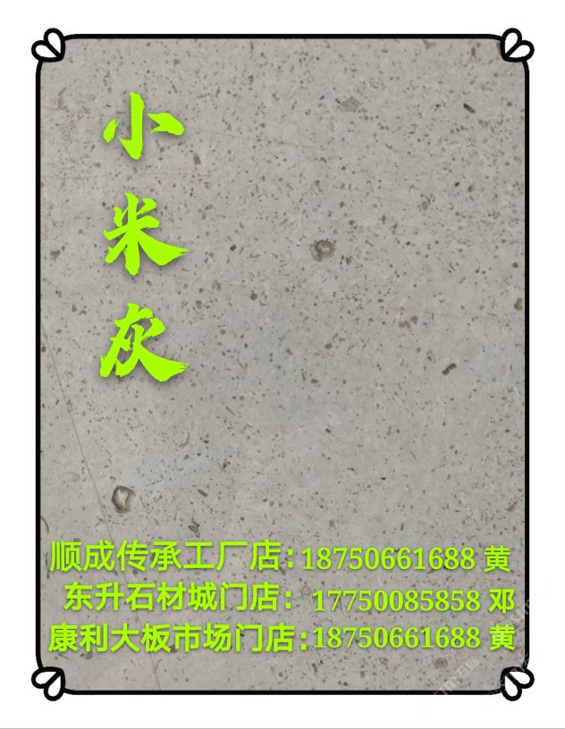 發(fā)布信息: (灰姑娘)天發(fā)工廠店:15278000702 伍 (小米灰)順成工廠店:18750661688 黃 (小米灰)東升石材城門店:17750085858鄧 (雅士灰,銀白龍)康利門店:18750661688 黃 廣信石材主營:灰姑娘,地中?;?,小米灰,雅士灰,銀白龍,南極灰,布魯斯灰,凱撒灰,賓利灰,美尼斯灰,新古堡灰等各類灰色天然大理石系列專場。#15278000702,灰姑娘,雅士灰,小米灰#