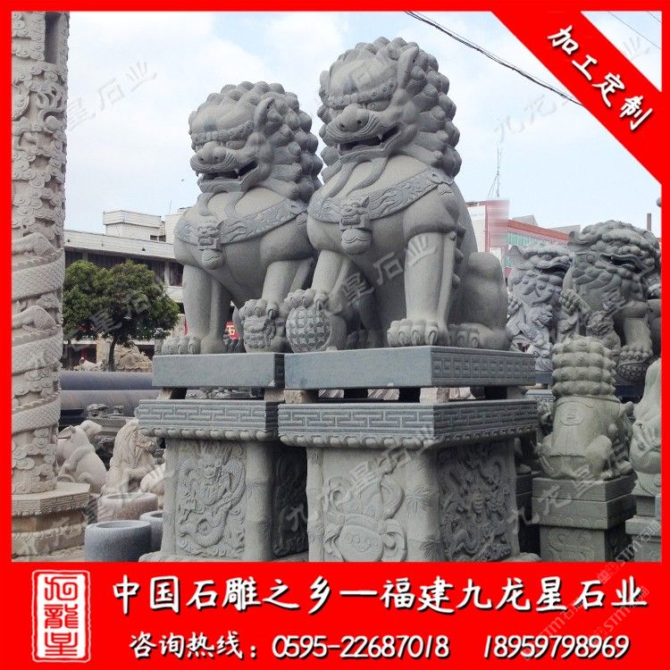 發(fā)布信息: 九龍星石業(yè)是石雕獅子廠家,從事石雕獅子加工制作20多年,石雕獅子款式多樣,價格合理。石雕獅子材質(zhì)可以為花崗巖、大理石、漢白玉、青石等等,望廣大新老客戶前來參觀考察和選購。 石雕獅子顧名思義就是有石材雕刻而成的石雕獅子,石刻石獅子寓意很多,深受人們喜歡,民間流傳石雕獅子的寓意都很吉祥。 傳統(tǒng)石雕獅子作為中國傳統(tǒng)建筑中經(jīng)常使用的一種裝飾物,人們喜愛將它擺放在家門口,有的獨(dú)立的獅子把門,有的放在門枕石上,有的與石鼓結(jié)合在一起。石雕獅千姿百態(tài),造型靈活。自唐代以來的大型石雕獅子基本上保持統(tǒng)一的坐姿,與漢代獅子石像常有的匍匐姿態(tài)相比,更接近于休憩而非狩獵,反映出唐代時期生活的富足、社會的安定,以及整個社會尤其是統(tǒng)治階級追求安逸、享樂的心態(tài)。大型石雕獅子有3米石獅子、2.8米石獅子也有2米石獅子。