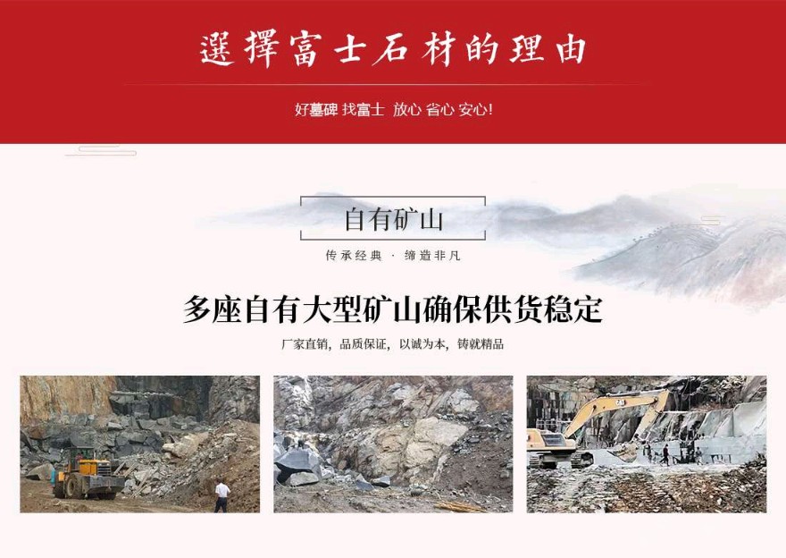 發(fā)布信息: 富士石材位于世界石雕之都——福建惠安,于1996年成立,主營(yíng)墓碑生產(chǎn)、墓碑研發(fā)設(shè)計(jì)、公墓運(yùn)營(yíng)&殯儀館運(yùn)營(yíng)、公墓陵園景觀、規(guī)劃設(shè)計(jì)等一條龍殯葬服務(wù)。公司自成立以來(lái)不斷引進(jìn)當(dāng)今世界先進(jìn)的生產(chǎn)設(shè)備及加工工藝,用專(zhuān)業(yè)的設(shè)備造優(yōu)秀的產(chǎn)品。公司擁有一大批經(jīng)驗(yàn)豐富的技術(shù)型管理人才,以嚴(yán)謹(jǐn)?shù)墓芾硖峁└咝У姆?wù),并配以先進(jìn)的電腦設(shè)計(jì)及現(xiàn)代化企業(yè)管理模式,秉承 “以客戶(hù)為中心、以質(zhì)量為根本,以市場(chǎng)為導(dǎo)向、以人文為基礎(chǔ)”的經(jīng)營(yíng)理念,經(jīng)過(guò)將近三十年的發(fā)展,逐步發(fā)展成為一家集墓碑加工生產(chǎn)、研發(fā)設(shè)計(jì)、陵園規(guī)劃設(shè)計(jì)、公墓運(yùn)營(yíng)&殯儀館運(yùn)營(yíng)為一體的公司。