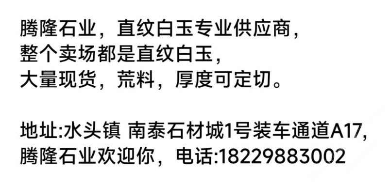 發(fā)布信息: 整個賣場都是直紋白玉, 歡迎各位朋友前來選購?? 騰隆石業(yè)——直紋白玉供應(yīng)商 南泰石材城1號通道A17 聯(lián)系電話:13599988860, 18229883002