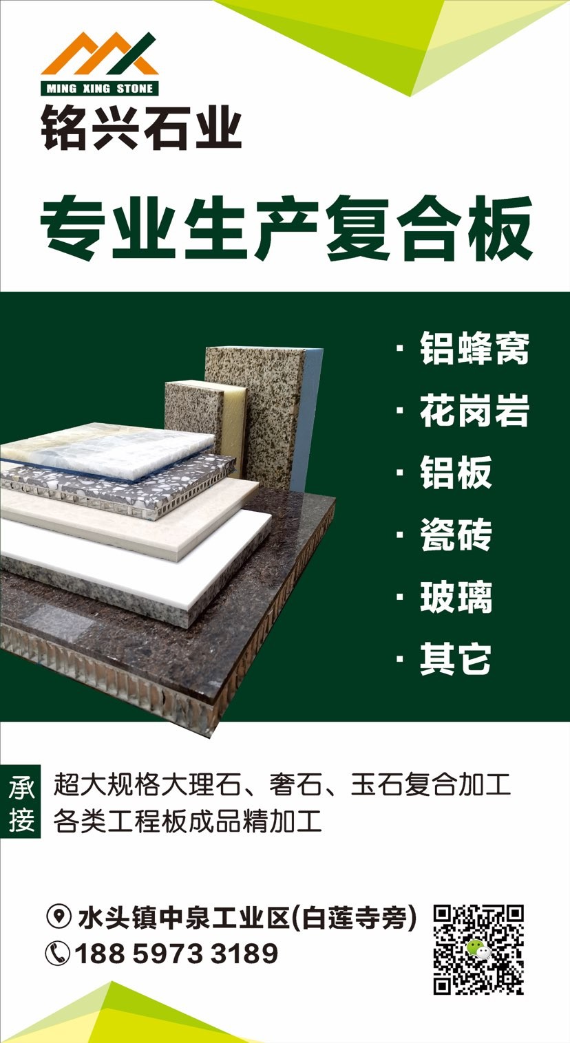 發(fā)布信息: 【銘興復(fù)合板】專(zhuān)業(yè)加工各類(lèi)石材復(fù)合板 1.承接大理石/花崗巖復(fù)合板工程、幕墻! (鋁蜂窩板、花崗巖、瓷磚,玻纖蜂窩板,人造石、玻璃等) 2.各類(lèi)超大規(guī)格石材復(fù)合板(3800×2100) 供應(yīng)各類(lèi)石材復(fù)合板成品,來(lái)料代加工!