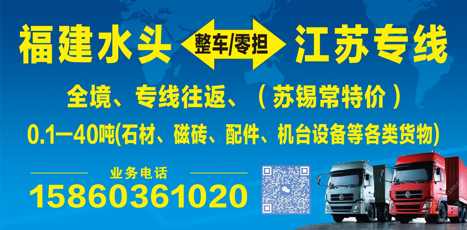 發(fā)布信息: 福建泉州水頭—江蘇全境,往返專線。 (蘇錫常特價(jià)?。?24小時(shí)在線接單 零擔(dān)~整車,0.1噸—40噸。 承接各類石材,瓷磚,機(jī)械等各類運(yùn)輸。 專注運(yùn)輸,用心服務(wù)??砷_發(fā)票。 江蘇專線15860361020。(微信同步)