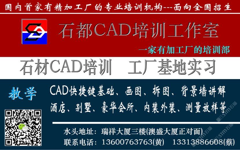 發(fā)布信息: 俗話(huà)說(shuō):“山無(wú)石不險(xiǎn),水無(wú)石不清,園無(wú)石不秀,居無(wú)石不雅,在水頭這個(gè)以石為主的地方---石都, 石都CAD培訓(xùn)工作室 一家有精加工廠(chǎng)的培訓(xùn)工作室 招生中... 地址:奧盛大廈對(duì)面瑞祥大廈三樓,聯(lián)系電話(huà):13600763763、136-2599-0077 我們有理想、有激情、團(tuán)隊(duì)專(zhuān)業(yè)、前景廣闊---只等你來(lái)大顯身手。
