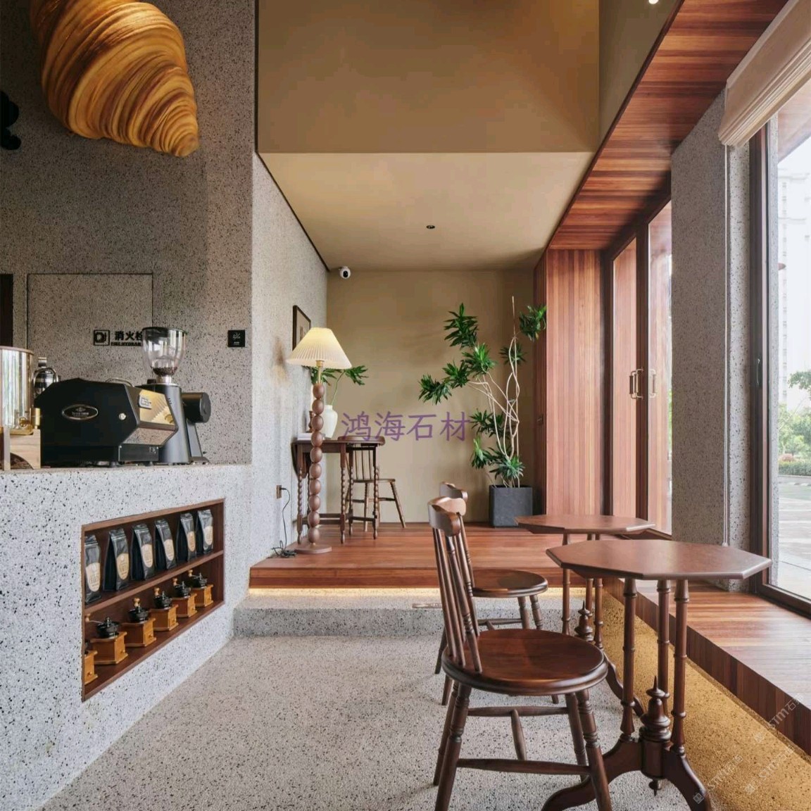 發(fā)布信息: 咖啡店設(shè)計干貨|水磨石 木格柵的組合 一進(jìn)門就被水磨石打造的吧臺狠狠洗衣,顆粒感的肌理搭配溫潤的木質(zhì)吊柜,觸感和視覺的碰撞真的太妙了~ 墻面的“與你相識雖不晚”直接戳中內(nèi)心,旁邊的巨型可頌裝置既是裝飾又點明了品類,細(xì)節(jié)感拉滿。 動線設(shè)計也很舒服,點單區(qū)和取餐區(qū)劃分清晰,哪怕人多也不會覺得擁擠,把功能性和美學(xué)平衡得恰到好處。