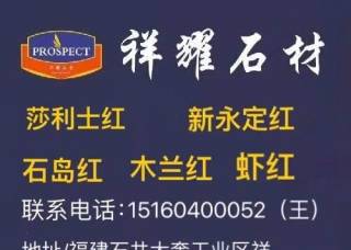 南安市祥耀石材有限公司(原惠慶石材)主營(yíng)產(chǎn)品:銹石1,銹石G682,黃銹石,石島紅,石島紅(老8號(hào)),石島紅(7號(hào)),G681蝦紅(光面),山東蝦紅,龍海蝦紅(紅底),G681,沙利士紅1,G606(正礦),山東白麻,山東白麻1企業(yè)地址:福建南安石井鎮(zhèn)三鄉(xiāng)大奎村祥耀石材